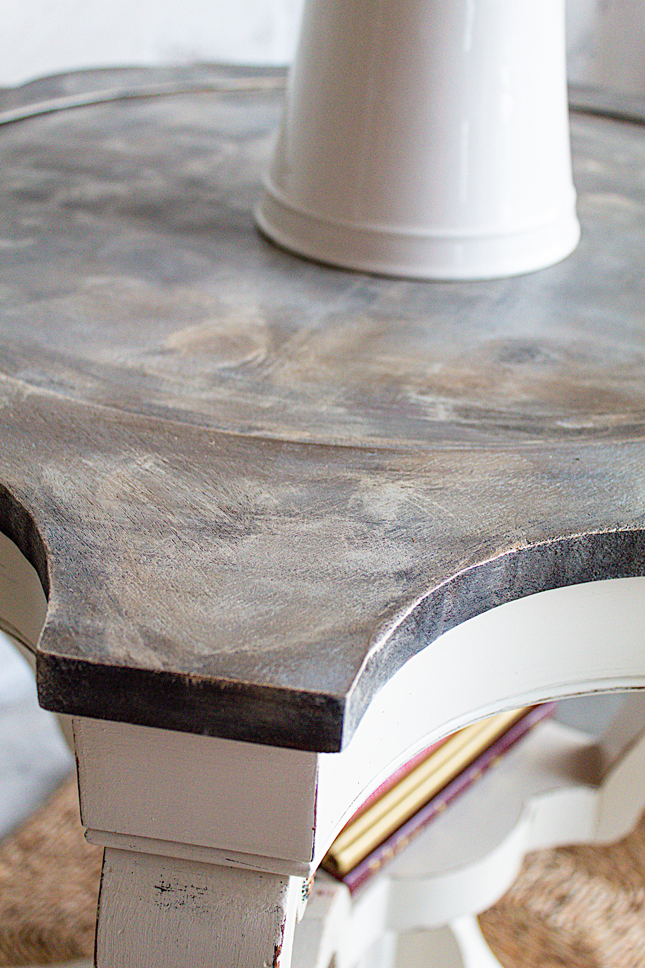 I couldn’t wait to try my ebony stain on this table top. I thought the dark contrast with the white paint would be perfect for the style I was aiming for.