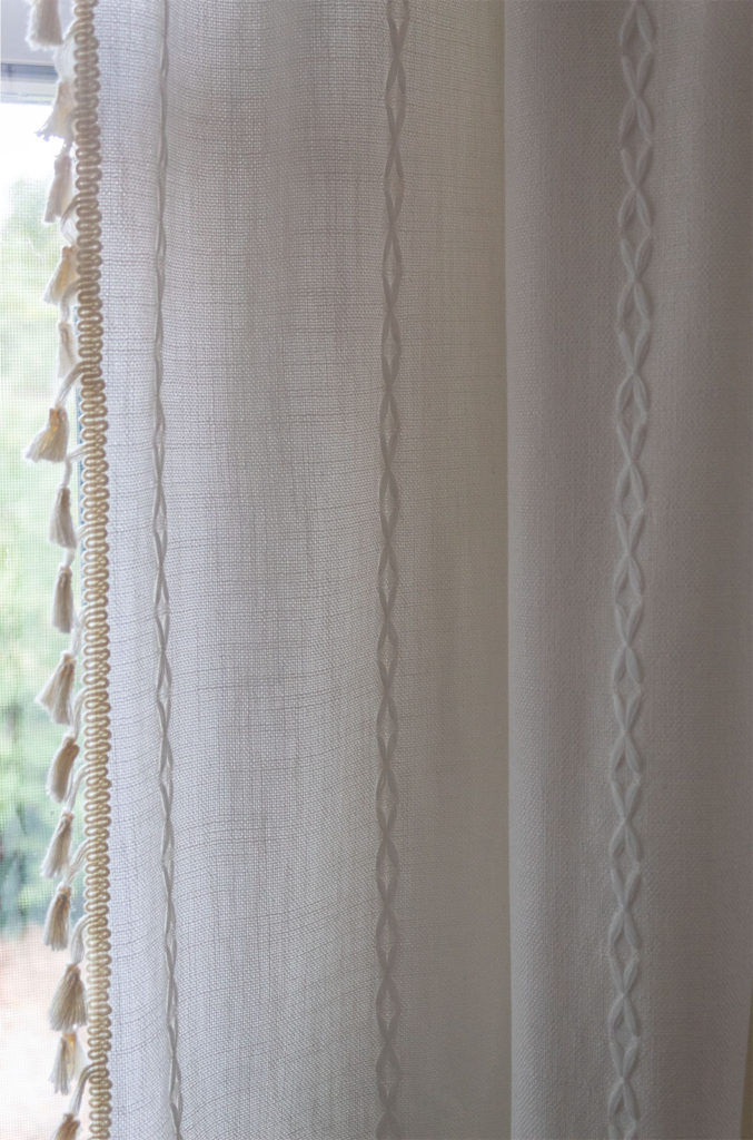 We painted the walls in SW’s Creamy for a soft, muted palette. It took me weeks to find just the right curtains. I had to return some that didn’t work. But when I got these Off White Boho Linen Curtains and hung them up, they were perfect! They filter the light beautifully while providing privacy at night. The stitching and tassels add such a stunning detail to the relaxed, yet stylish ambience of the room.