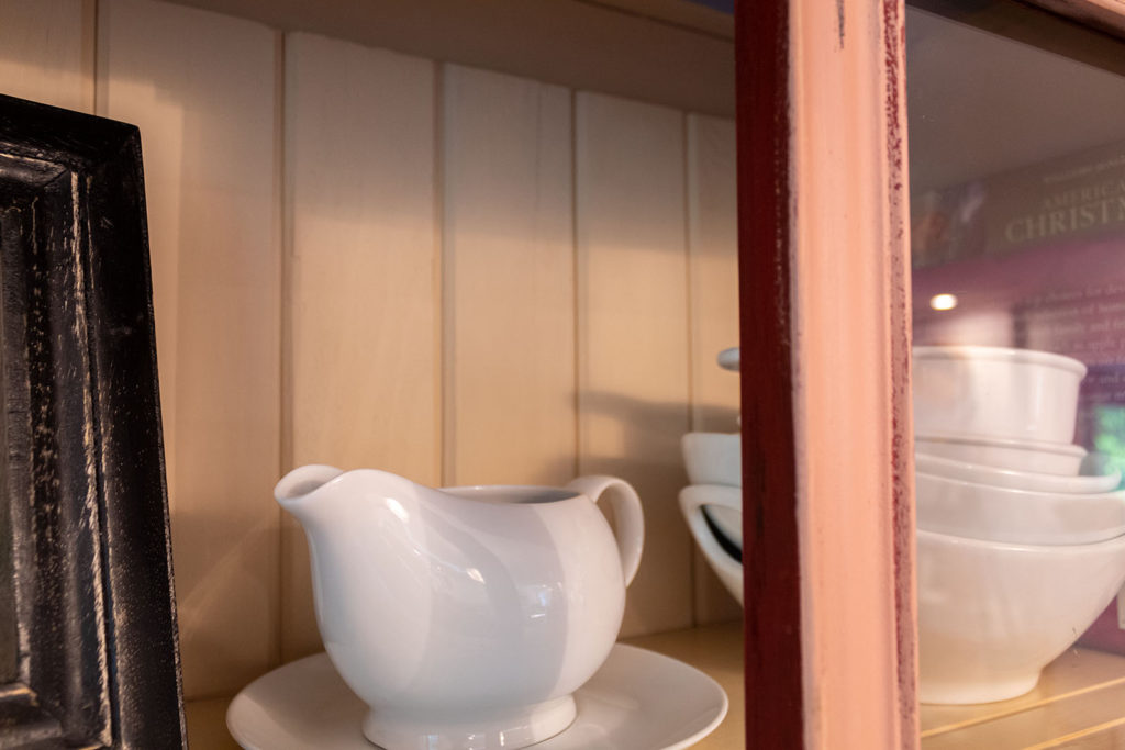 Inside the hutch I added some of the wedding china that belonged to my mom and a few other ceramics and books. I love the concept of cabinets of curiosities, so mixing in a few different things was intentional. I was careful, however, to not make the hutch look too stuffed with things.